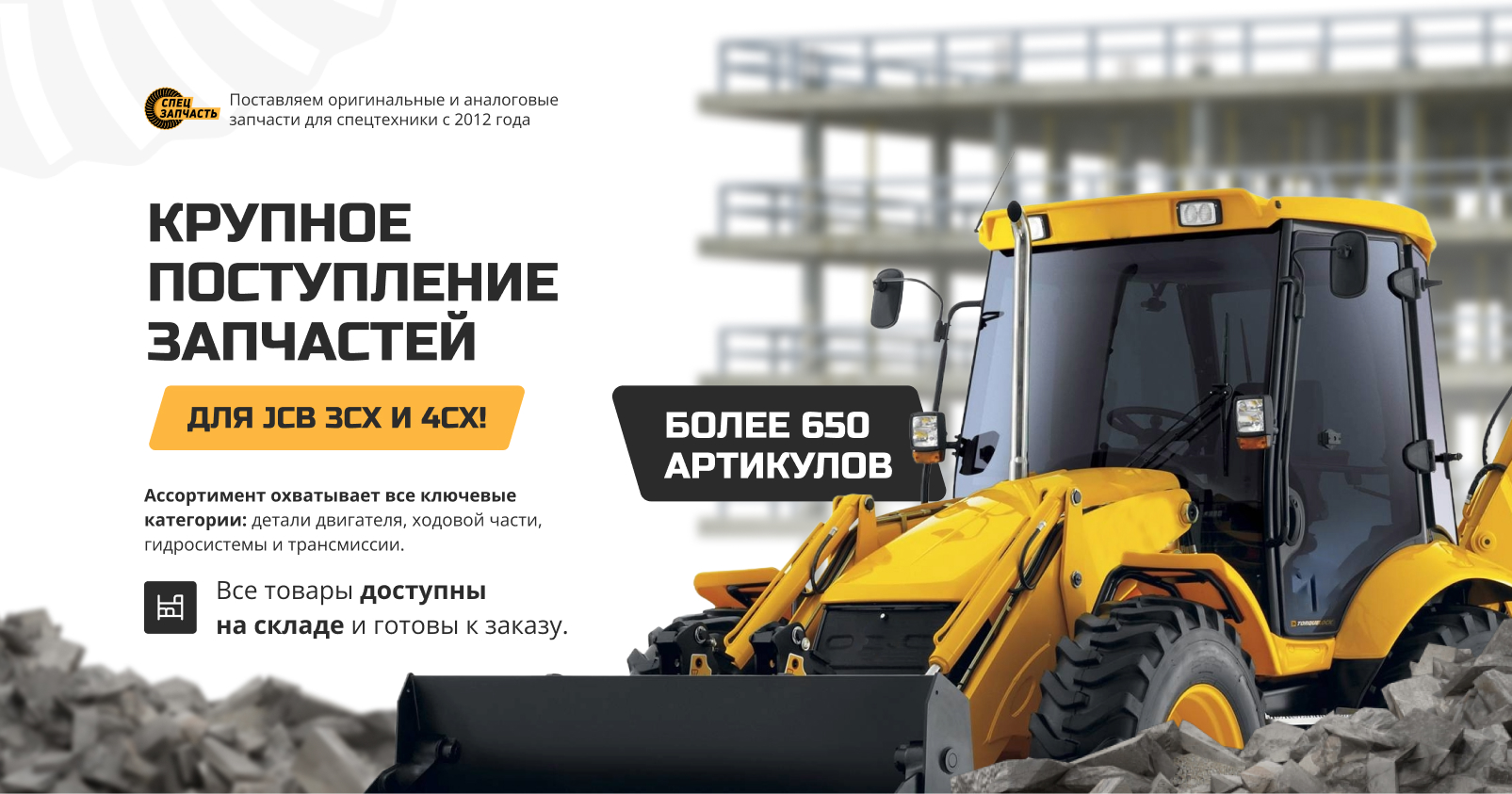 Компания «СПЕЦЗАПЧАСТЬ40» информирует о поступлении на склад в Калуге крупнейшей за последнее время партии запчастей для экскаваторов-погрузчиков JCB моделей 3CX и 4CX. Данное поступление включает более 650 наименований компонентов, что позволяет предложить клиентам исключительно широкий выбор деталей для обслуживания и ремонта популярной техники JCB.